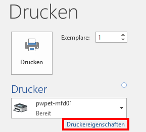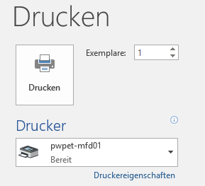 Im Menu «Drucken» wählen Sie den Netzwerkdrucker Ihres Standortes aus, z. B. «pwpet-mfd01».