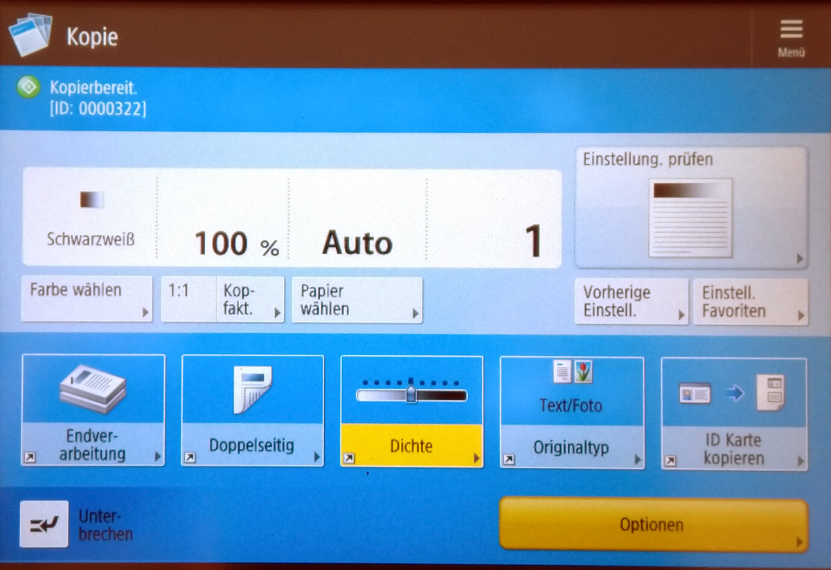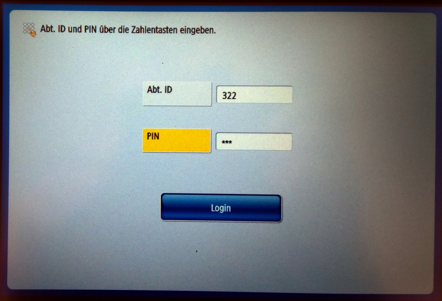 Melden Sie sich mit Ihrer «Abteilungs-ID» sowie Ihrer «PIN» am Multifunktionsgerät an.