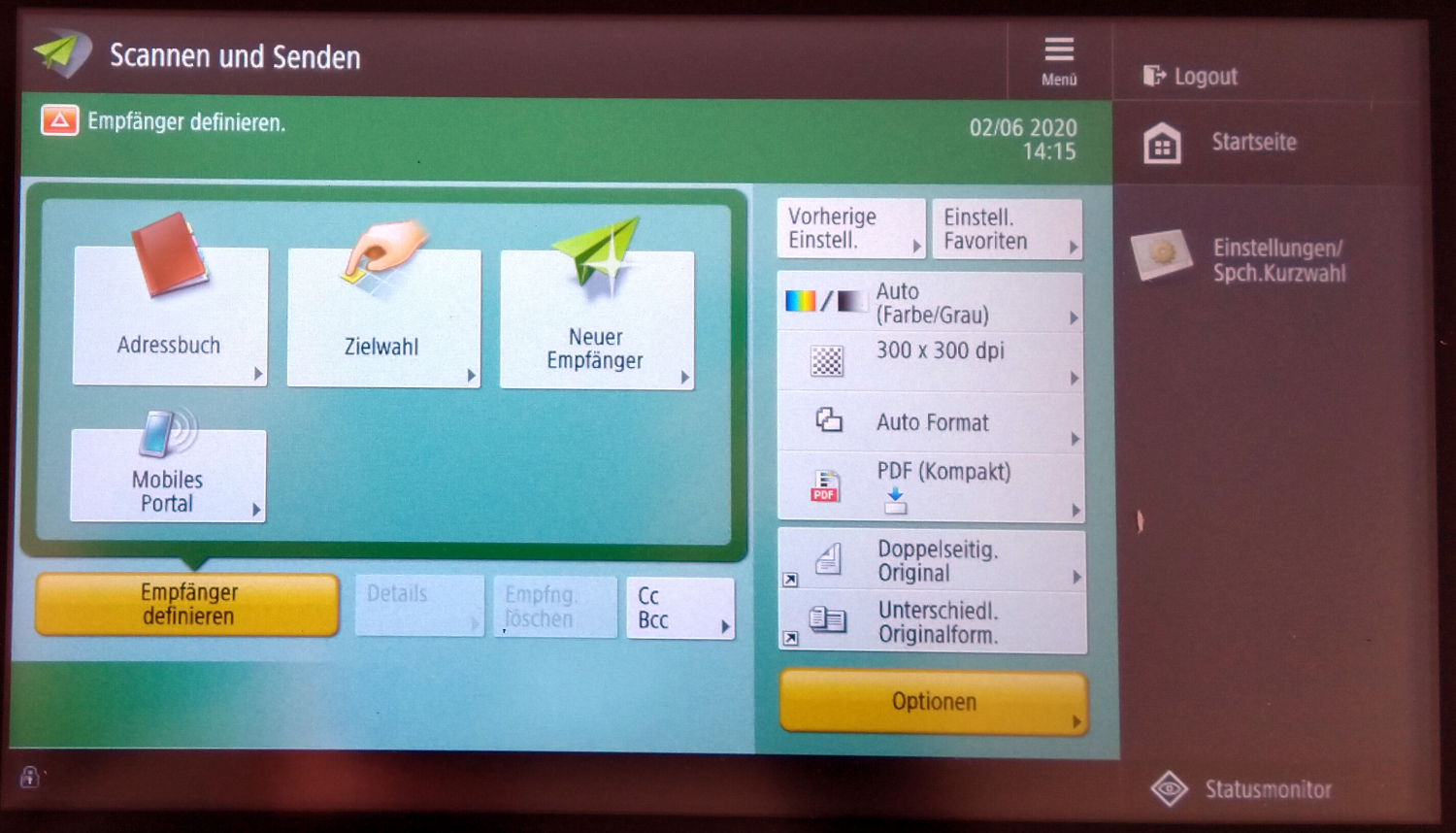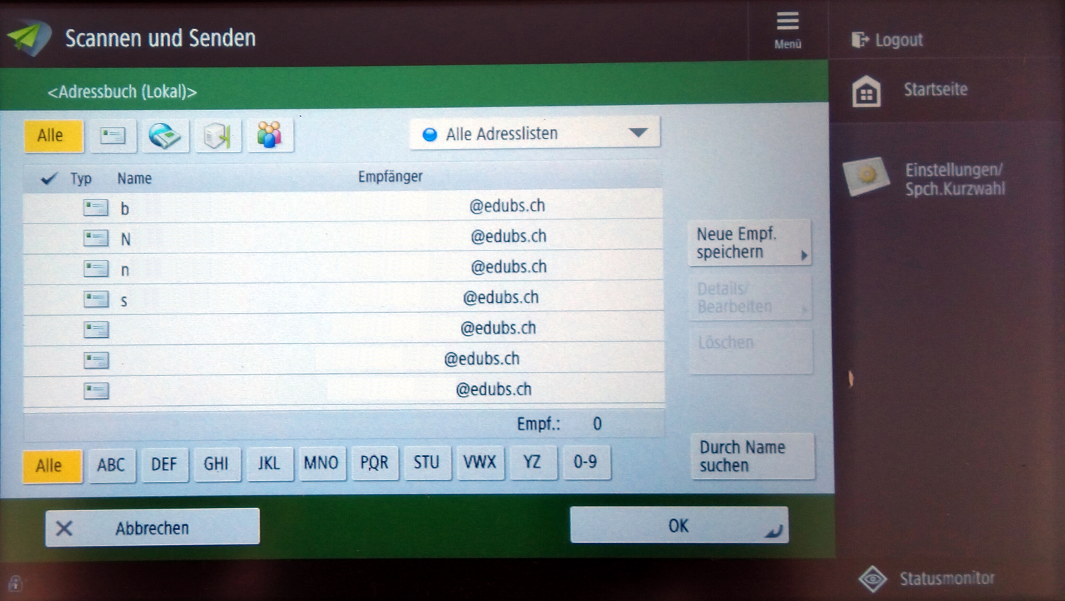 Möchten Sie das Dokument an Ihre E-Mail-Adresse senden, wählen Sie «Adressbuch» aus. Alternativ kann das Dokument auch via «Zielwahl» an einen angeschlossenen USB-Stick gesendet werden.