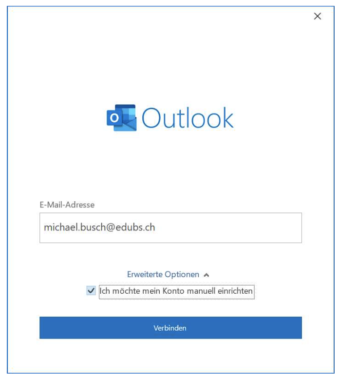 «Erweiterte Optionen» aufklappen, «Ich möchte mein Konto manuell einrichten» markieren und mit «Verbinden» fortfahren.
