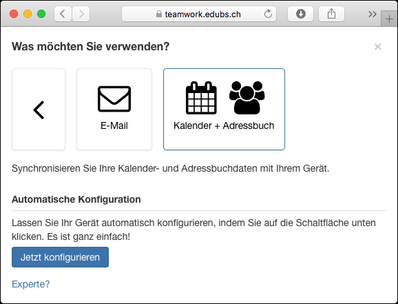 «Kalender + Adressbuch» anklicken und mit «Jetzt konfigurieren» fortfahren.