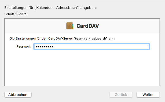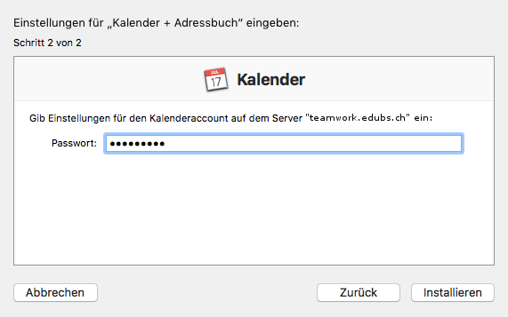 Das Passwort für den «CardDAV-Server» (eduBS-Passwort) eintippen und auf «Weiter» klicken. Anschliessend das Passwort für den «Kalenderaccount» (eduBS-Passwort) eintippen und auf «Installieren» klicken.