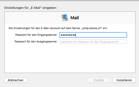 Das «Passwort für den Eingangsserver» (eduBS-Passwort) eintippen und auf «Installieren» klicken. Die E-Mail-Einstellung ist zwar nicht signiert aber dennoch vertrauenswürdig, da sie von eduBS kommt.