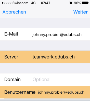 Geben Sie bei «Server» «teamwrok.edubs.ch» und anschliessend ihren «Benutzername» (mit @edubs.ch) ein.