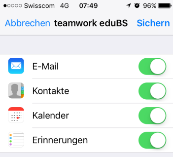 Dank der Synchronisation von eduBS-teamwork mittel EAS ist es möglich, Mail, Kalender, Aufgaben und eigene Kontakte in einer Standard-App wie G-Mail anzeigen zu lassen. Allerdings gilt zurzeit noch, dass persönliche Adresslisten und von Lehrpersonen an Lernende freigegebene Kalender nicht synchronisiert, sondern nur im Web-Interface angezeigt werden.