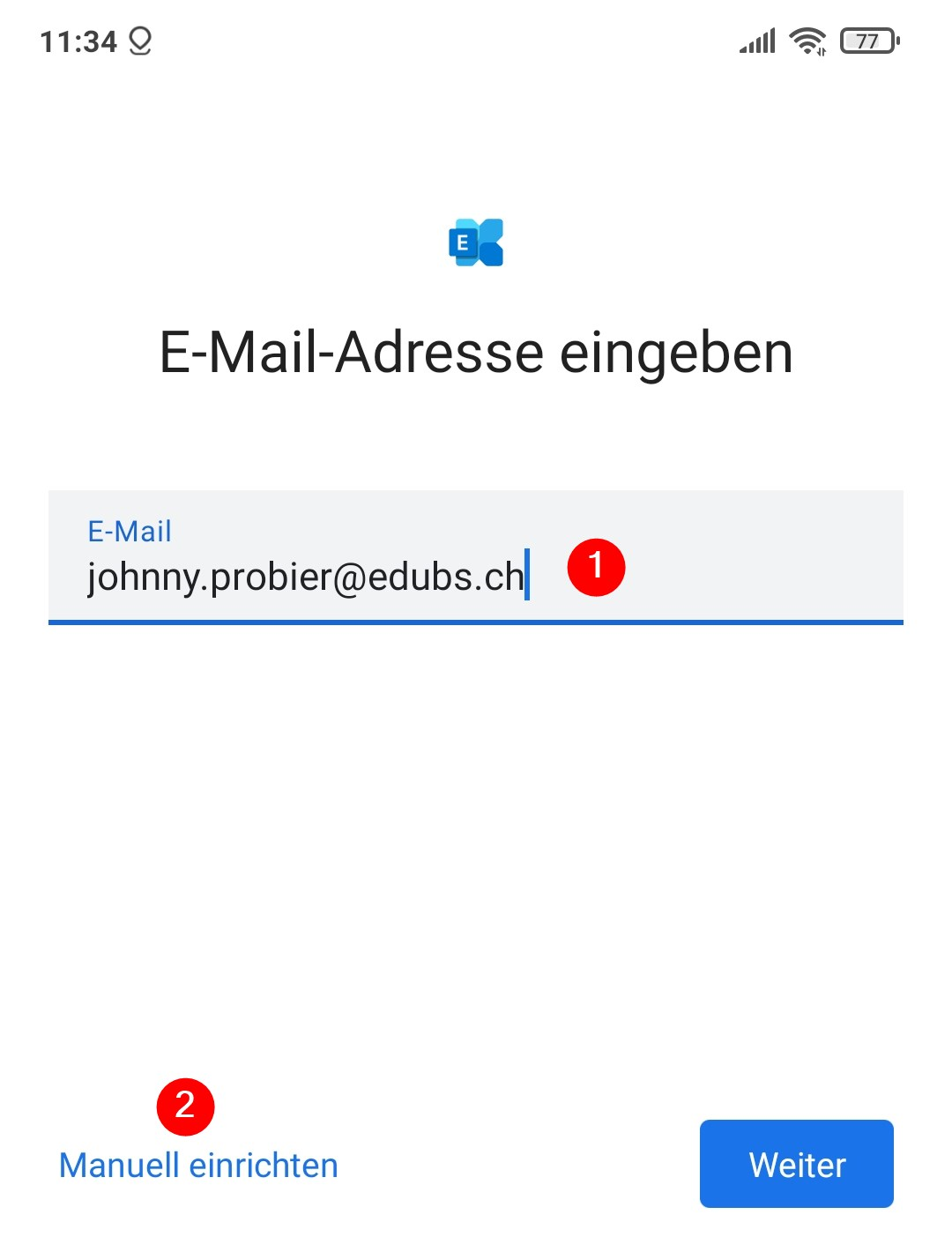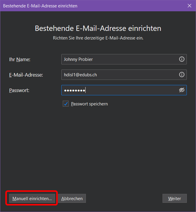 «Ihr Name», «E-Mail-Adresse», «Passwort» eingeben und anschliessend auf «Manuell einrichten» klicken.