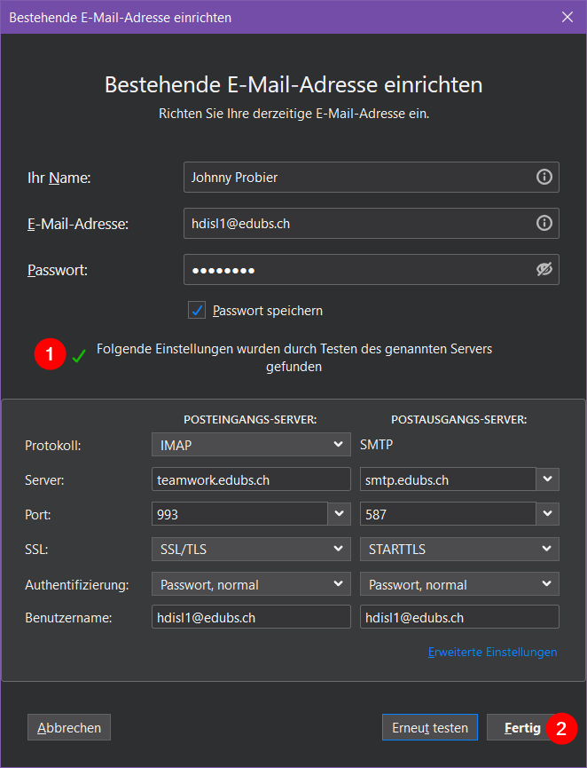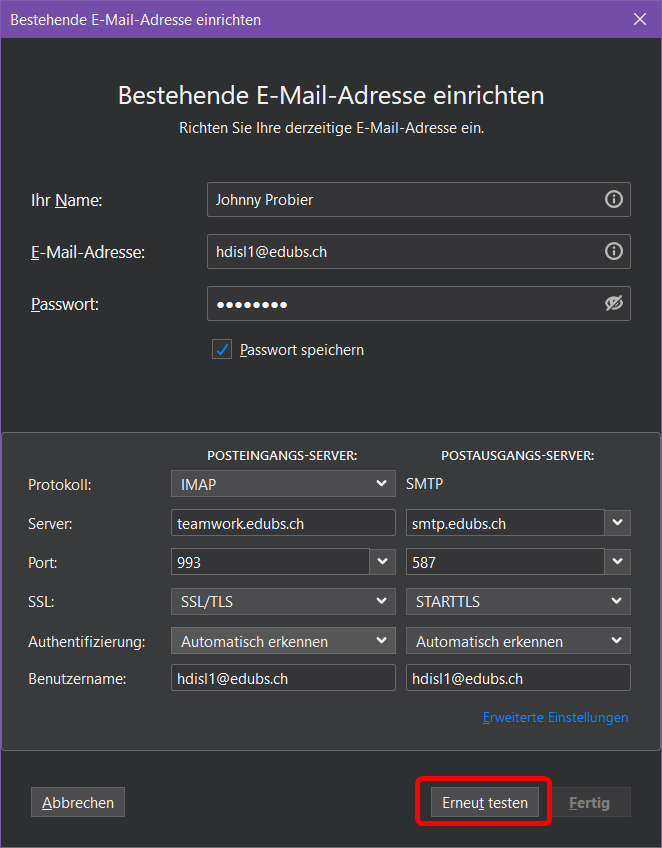 Geben Sie die Angaben für den Posteingangs- und Postausgangsserver gemäss nebenstehendem Bild ein und bestätigen Sie anschliessend mit «Erneut testen».
