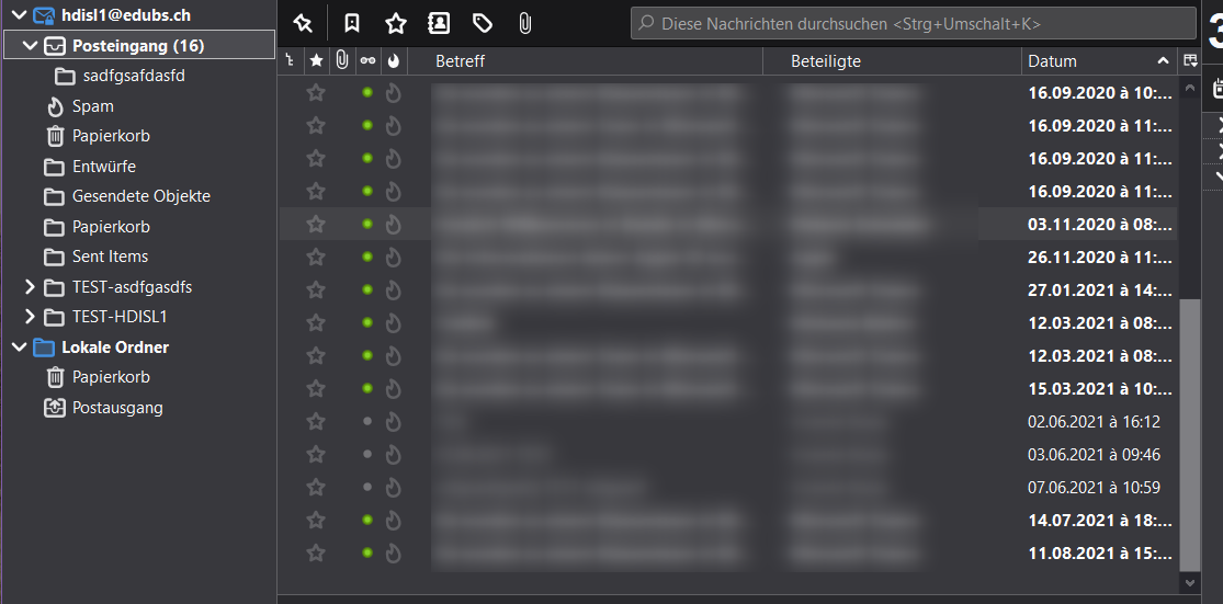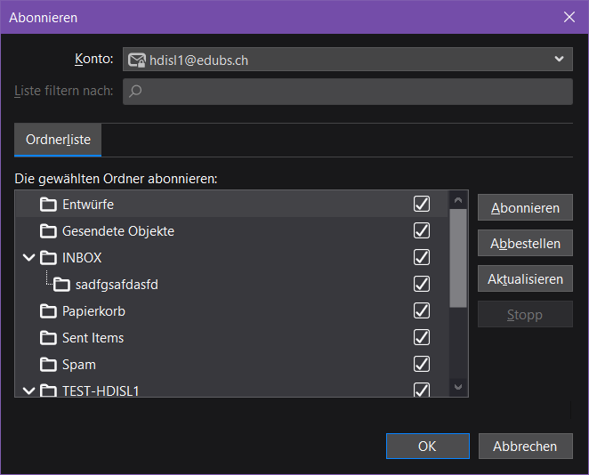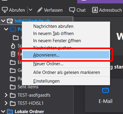 Prüfen Sie per Rechtsklick auf das Konto und einen anschliessenden Linksklick auf «Abonnieren», ob alle Ordner mit Thunderbird synchronisiert werden. Falls nicht, markieren Sie die entsprechenden Ordner (Häkchen) und klicken Sie anschliessend auf «Abonnieren» --> «OK».