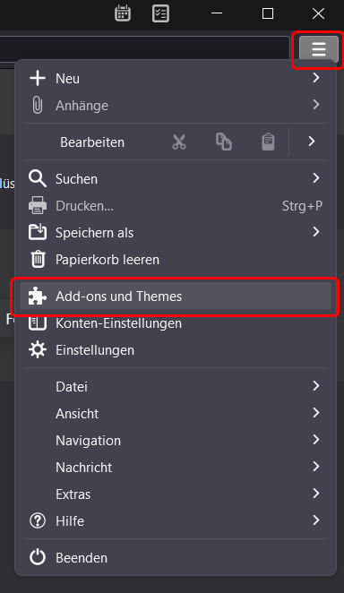 Für die Synchronisation von Terminen und Aufgaben muss bei Thunderbird ein sogenanntes Add-On installiert werden. Klicken Sie dazu auf das sogenannte «Hamburger-Menu» und anschliessend auf «Add-Ons und Themes».