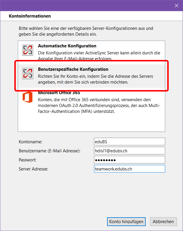 Wählen Sie «Benutzerspezifische Konfiguration» und geben Sie anschliessend die Angaben zu ihrem Konto ein. Bestätigen Sie anschliessend mit «Konto hinzufügen».