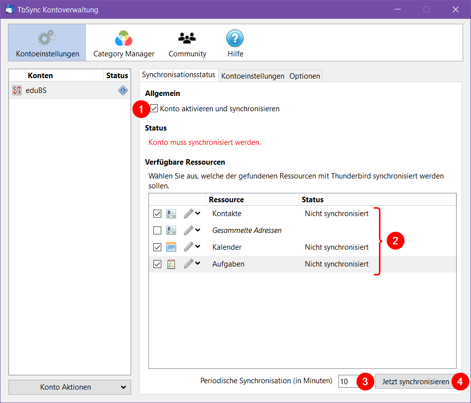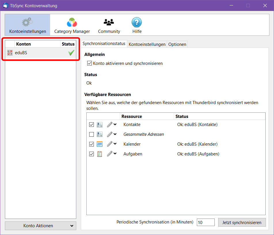 Klicken Sie auf «Konto aktivieren und synchronisieren». Wählen Sie anschliessend die Ressourcen, welche synchronisiert werden sollen. Stellen Sie anschliessend die «Periodische Synchronisation in Minuten» auf 10 Minuten ein und bestätigen sie mit «Jetzt synchronisieren».