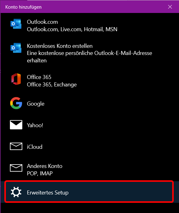- Die Synchronisation via sogenanntes «Exchange Active Sync» bietet die Möglichkeit, E-Mails, Kontakte, Kalendereinträge, Aufgaben und Notizen zu synchronisieren, ist aber eher fehleranfällig. Die Einrichtung erfolgt nach Eingabe der E-Mail-Adresse grundsätzlich automatisch. Eine Anleitung zum Einrichten von Outlook mit «Exchange Active Sync» finden Sie ausserdem auf der Hilfeseite von Microsoft.
