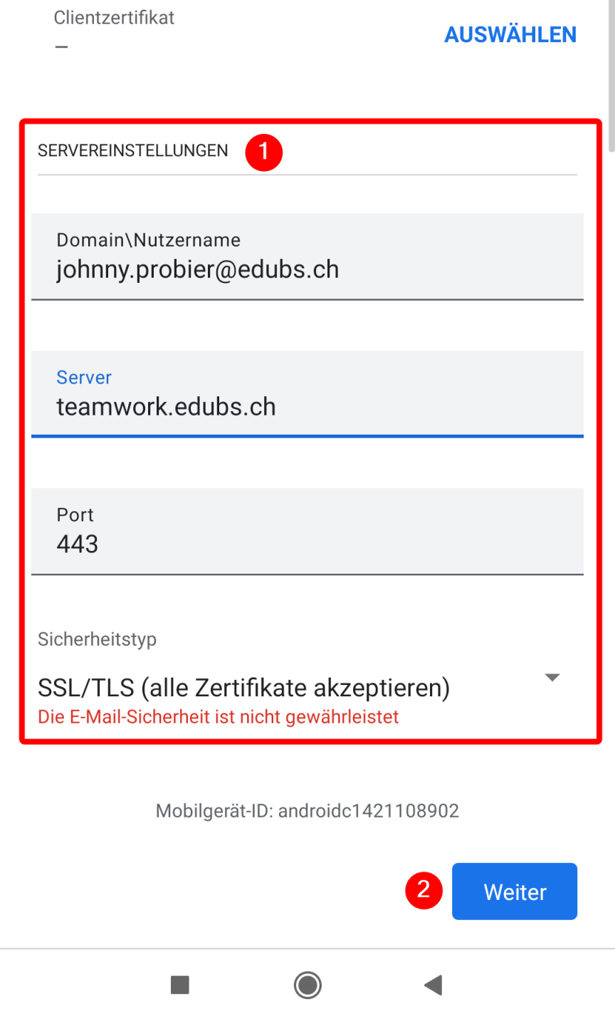 Sicherheitstyp: SSL/TLS (alle Zertifikate akzeptieren)