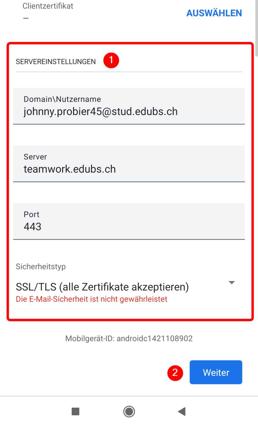 Sicherheitstyp: SSL/TLS (alle Zertifikate akzeptieren)