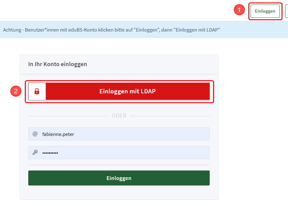 Klicke auf «Einloggen» und anschliessend auf «Einloggen mit LDAP»