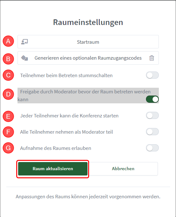 Klicke nach Anpassung der Raumeinstellungen auf «Raum aktualisieren».