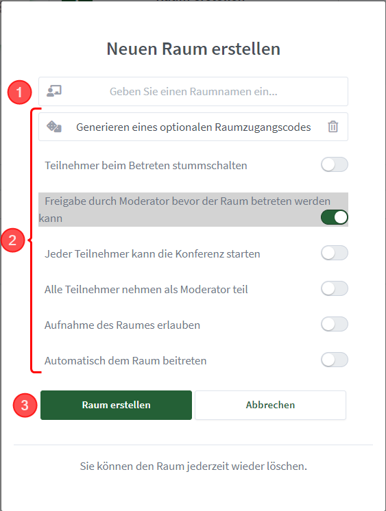 Gib einen Namen für den neuen Raum ein. Stelle danach ein, was die Teilnehmenden in der Besprechung machen dürfen. Schliesse den Vorgang mit Klick auf «Raum erstellen» ab. Du kannst danach jederzeit die Einstellungen im Raum verändern (siehe «Besprechung organisieren»).