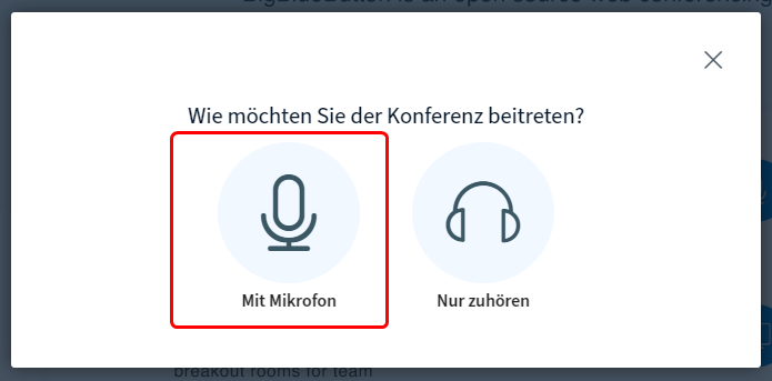 Die Besprechung wird gestartet. Du hast nun die Möglichkeit, an der Besprechung nur zuzuhören oder mit Mikrofon teilzunehmen. Wähle hier «Mit Mikrofon».