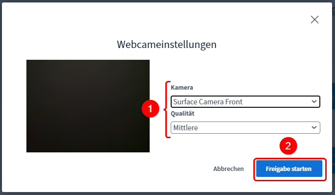 Möchtest du die Ihre Kamera für die Besprechung freigeben, klicken auf das Kamera-Symbol. Im nun folgenden Popup wählst du zuerst die Kamera und danach die Übertragungsqualität. Bestätige mit «Freigabe starten».