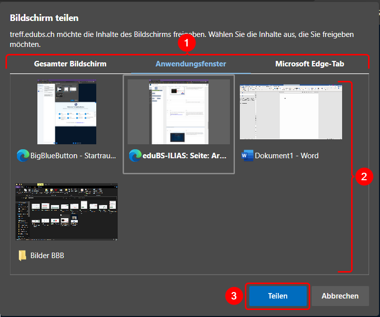 Möchtest du deinen Bildschirm teilen, klicke zuerst auf das passende Symbol. Wähle anschliessend den Inhalt, welchen du teilen möchtest. Du hast die Möglichkeit, den ganzen Bildschirm, ein bestimmtes Fenster oder Inhalte eines Browser-Tabs zu teilen. Bestätige anschliessen mit «Teilen».