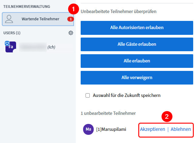 Möchten Personen an deiner Besprechung teilnehmen, werden diese als «Wartende Teilnehmer» angezeigt. Klicke auf das Symbol und lege danach fest, ob die Personen an der Besprechung teilnehmen dürfen.