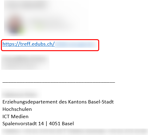 Möchtest du eine Besprechung organisieren, teilst du nun den Link zum Besprechungsraum mit den Teilnehmenden. Verwende dazu zum Beispiel eduBS-Teamwork. Vergiss nicht, in der Nachricht auch Datum und Uhrzeit der Besprechung zu nennen.