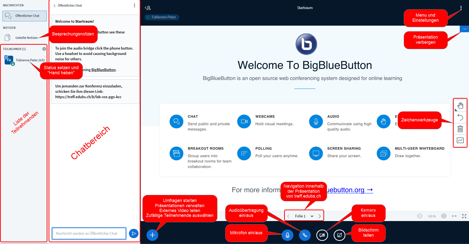 Du siehst jetzt den Hauptbildschirm der Besprechung mit folgenden Funktionen: