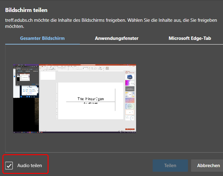 Videos und Tondateien kannst du via neuen Browser-Tab oder die Auswahl «Gesamter Bildschirm» teilen. Aktiviere dazu vorgängig die Funktion «Audio teilen».