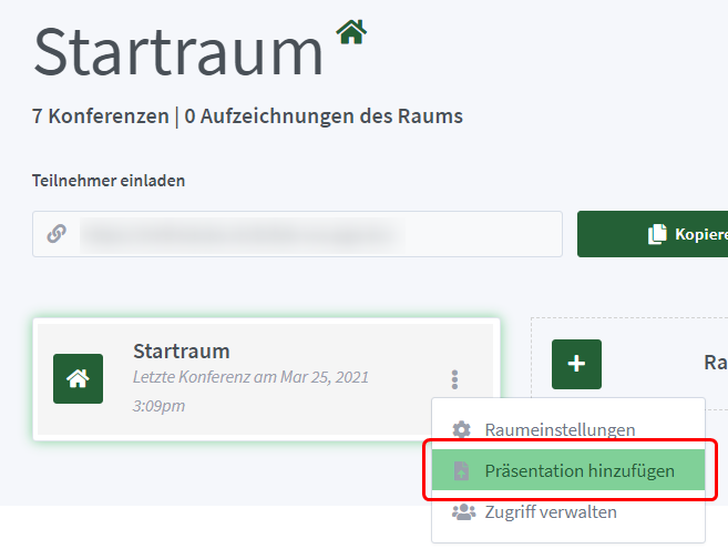 Jeder Raum bietet die Möglichkeit, Präsentationen einzufügen. Klicke dazu zuerst auf den gewünschten Raum und danach im Dreipunkte-Menu auf Präsentation hinzufügen.