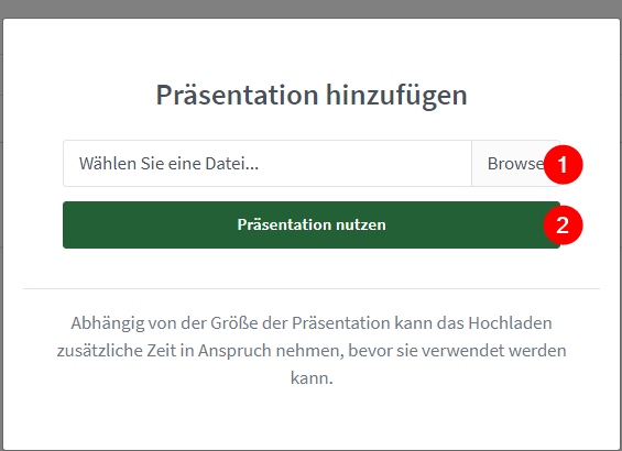 Klicke im Popup zuerst auf «Browse». Du kannst nun eine Präsentation auswählen. Danach klickst du auf «Präsentation nutzen». Deine Präsentation wird nun hochgeladen und danach in der Besprechung angezeigt.